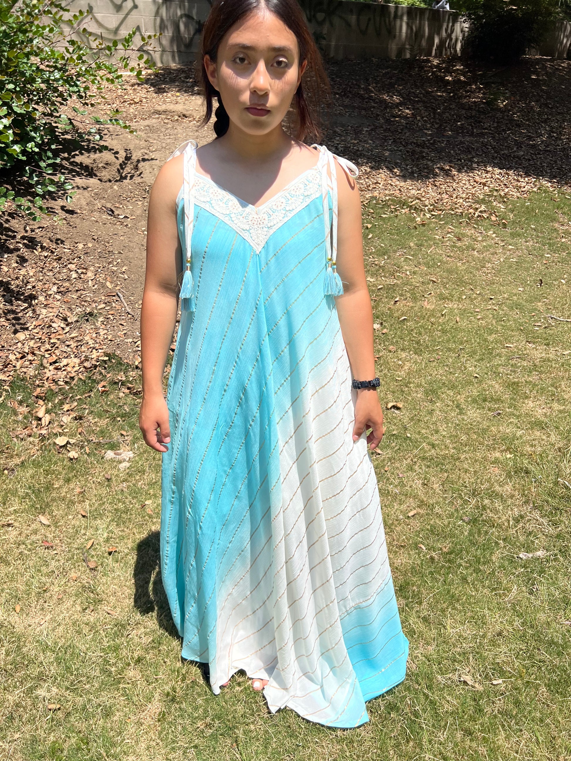 Dress is made of 100% rayon with metallic decorative threads , with very thin and soft cotton lining. It can be worn as a street dress or home dress or even as sleepwear, night dress . It is extremely comfortable and beautiful for any occasion.